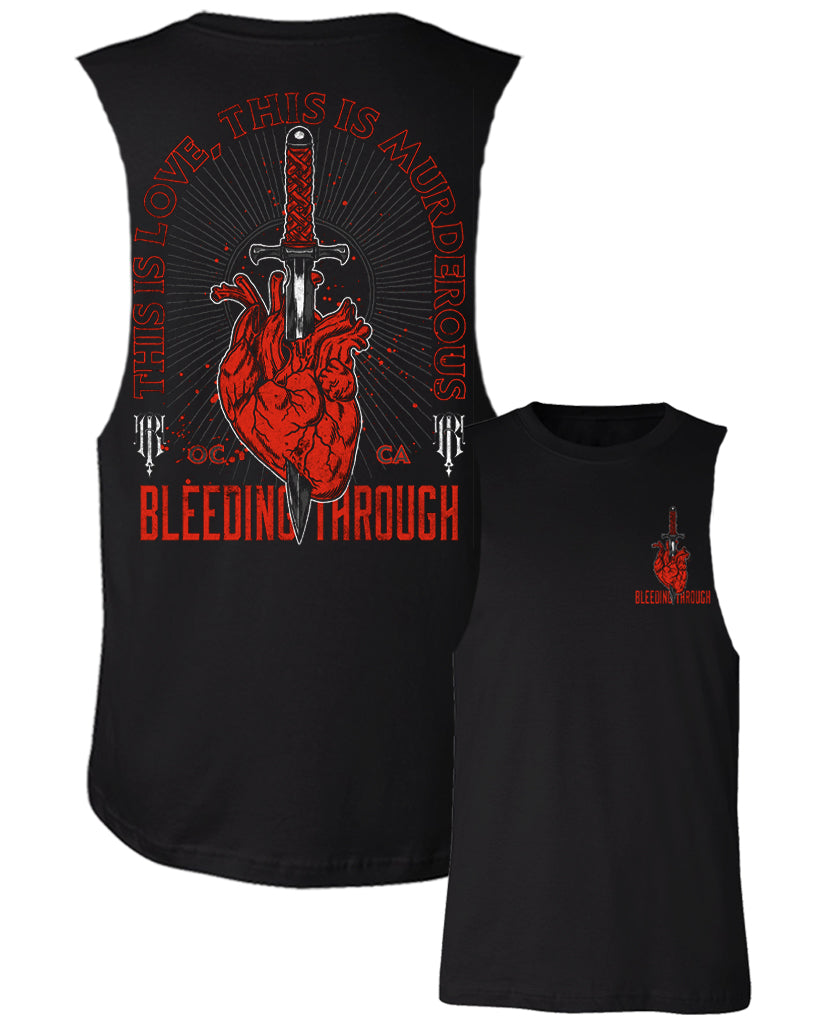 Unisex Custom Cut Muscle Tee; "BLEEDING THROUGH" Front Pocket Print; "THIS IS LOVE THIS IS MURDEROUS" Back Print