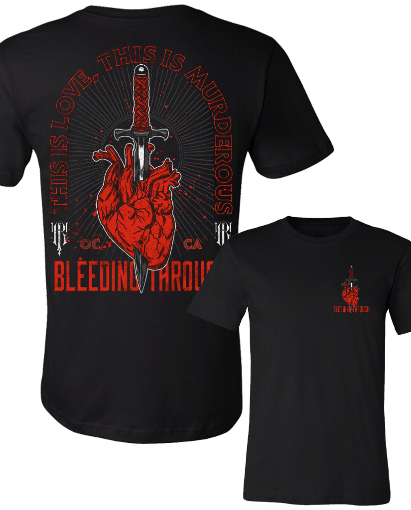 Unisex Premium Jersey Tee; "BLEEDING THROUGH" Front Pocket Print; "THIS IS LOVE THIS IS MURDEROUS" Back Print