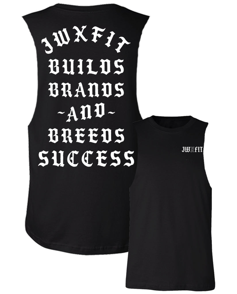Unisex Custom Cut Muscle Tee; "JW X FIT" Front Pocket Print; "JW X FIT BUILDS BRANDS AND BREEDS SUCCESS"