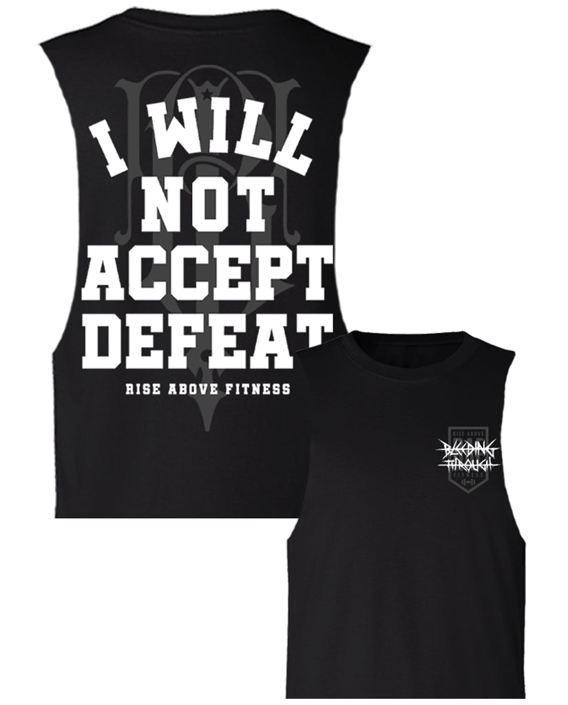 Women's Custom Cut Crop Muscle Tee; "RAF BADGE X BLEEDING THROUGH" Front Pocket Print; "I WILL NOT ACCEPT DEFEAT X BT MONOGRA," Back Print